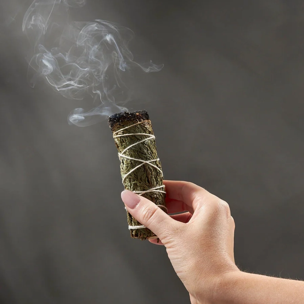 - 點燃雪松杖一端,輕吹讓火熄滅,留下煙霧