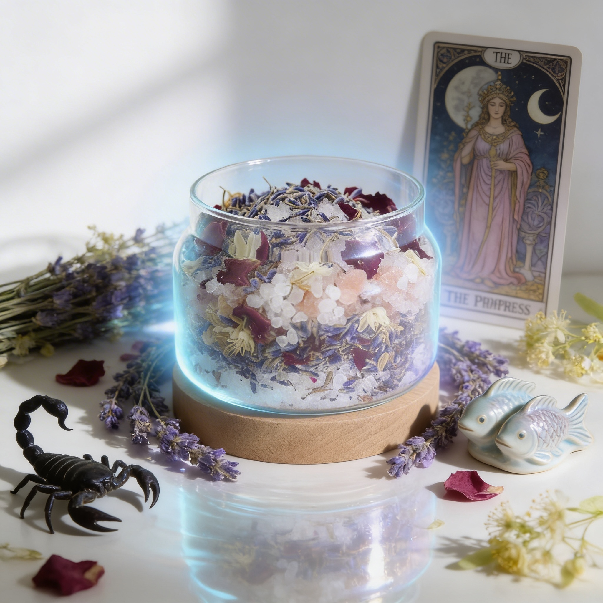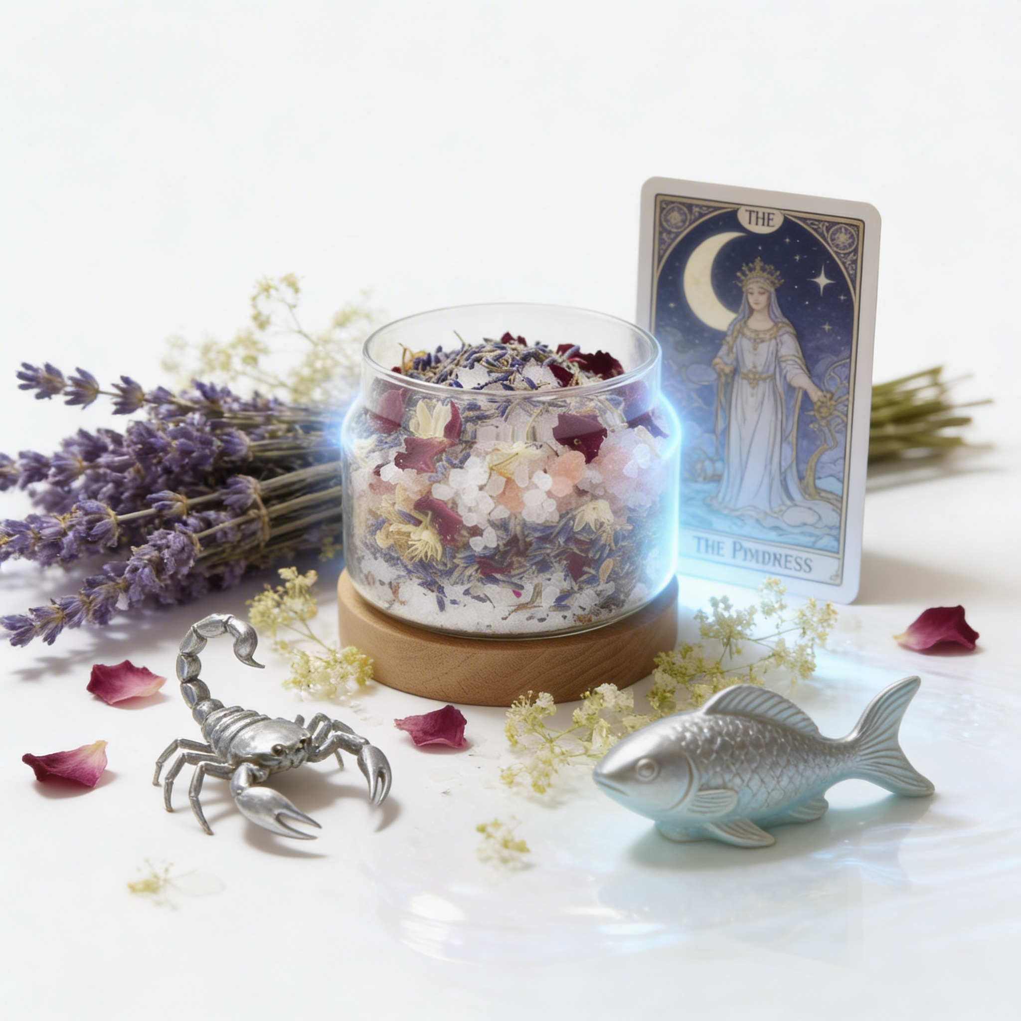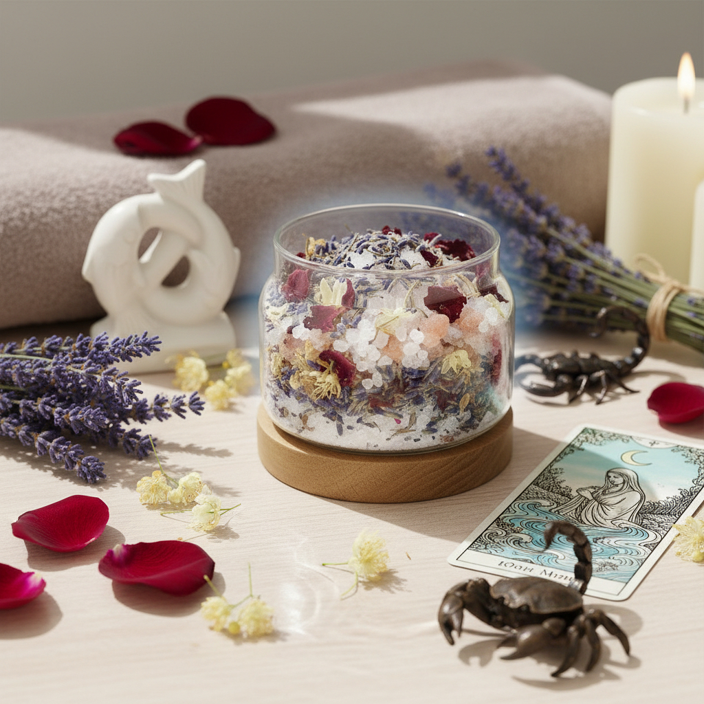 天蠍座情感濃烈而深沉,許多情緒不輕易表露,卻在內心堆積。玫瑰花瓣與玫瑰天竺葵精油的細緻花香,結合海鹽與粉紅鹽的淨化特質,協助天蠍在空間中釋放壓抑與執著,讓情緒有出口,讓心重新流動。 - 雙魚座|穩定邊界與回到自身中心