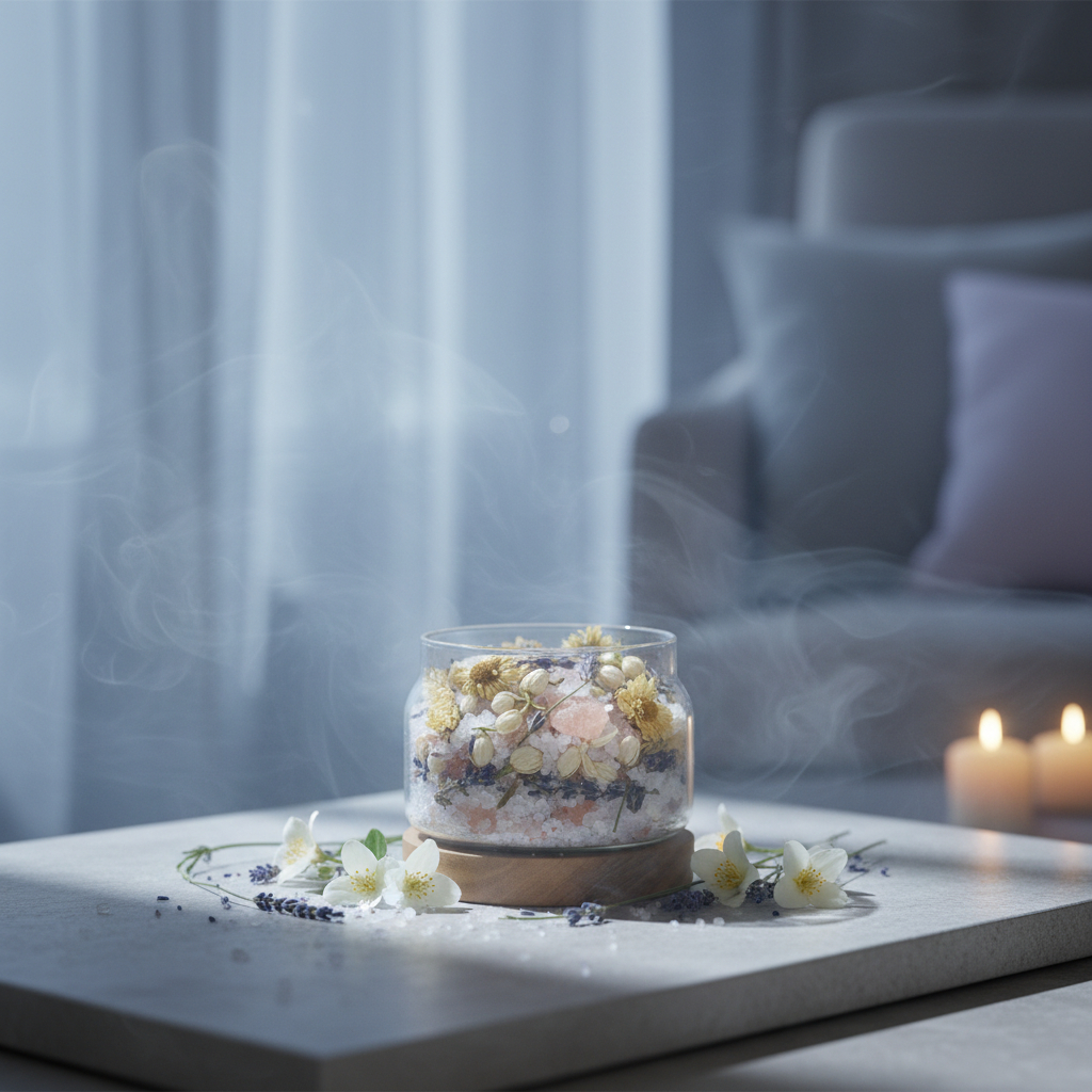 五行|水行流動安撫海鹽 以溫潤花香與安撫型精油為核心調性,結合天然鹽礦物的淨化特質,為空間帶來靜謐卻不沉重的氣息層次。它協助打造一種情緒可以慢慢流動的環境氛圍,讓焦慮被溫柔稀釋,讓壓力被柔化承接。